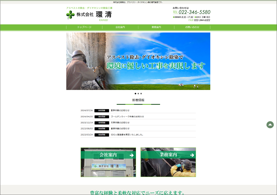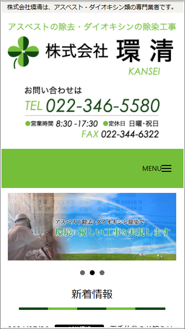 アスベスト除去・ダイオキシン除染業者の株式会社環清様のホームページを新規作成しました。